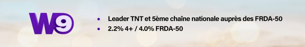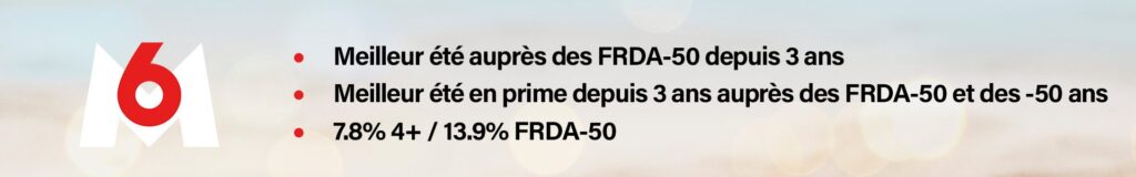 Très bon été pour le Groupe M6 qui réalise la plus forte progression auprès de la cible commerciale parmi les groupes et un été historique auprès des moins de 50 ans (13.2% 4+ / 22.8% FRDA-50)