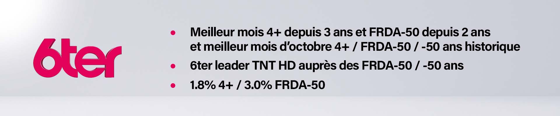 Le Groupe M6 réalise auprès de la cible commerciale son meilleur mois d’octobre depuis 4 ans et son meilleur mois 4+ en prime cette année. Il est le seul grand groupe à progresser auprès de la cible commerciale