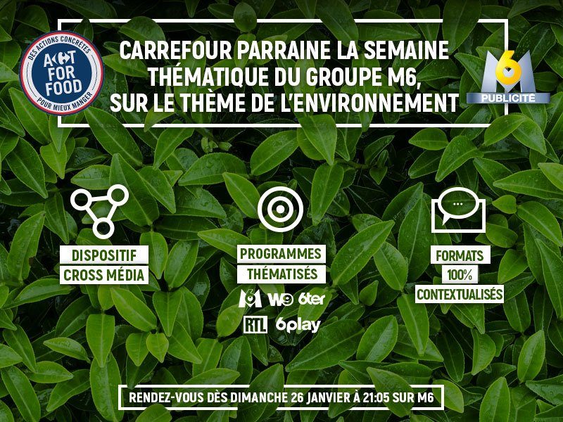 Dans la continuité de cette mobilisation éditoriale, Carrefour, fidèle à son engagement pour la transition alimentaire Act For Food, sur les conseils de son agence Socialyse Paris et avec M6 Publicité, sera le parrain de cette semaine thématique.