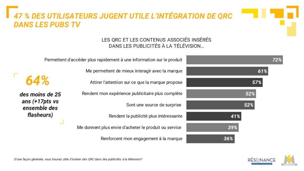 Pour autant, 47% des flasheurs jugent leur présence dans des spots TV utile, en particulier les moins de 25 ans (64% soit +17pts vs l’ensemble des flasheurs). Pourquoi ? Car les QR codes permettent d’accéder plus rapidement à une information produit pour 72% des flasheurs. Et l’intégration d’un QR Code dans un spot TV permet également d’enrichir l’expérience publicitaire pour 52% des interrogés.