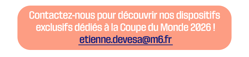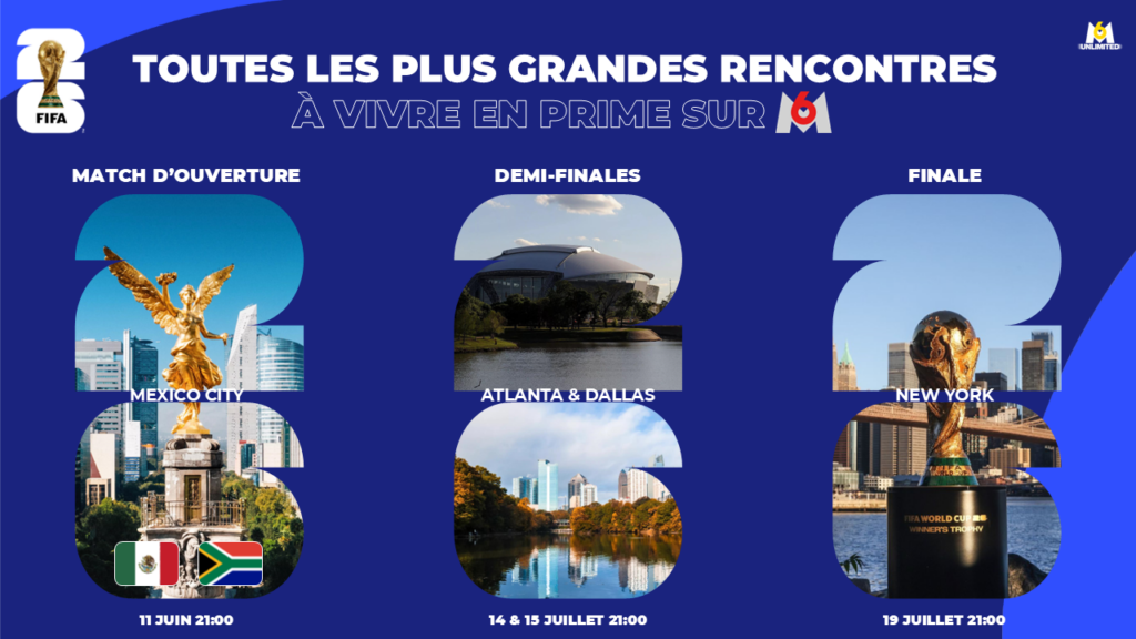 Dans le cadre de la Coupe du Monde de la FIFA 2026™, M6 Unlimited proposera une gamme d’offres multicanales alliant télévision, digital, data, radio, audio et OPS. Conçues sur mesure, ces solutions répondront aux besoins de visibilité des marques en leur offrant une présence exceptionnelle sur le plus grand événement de l’année 2026 !