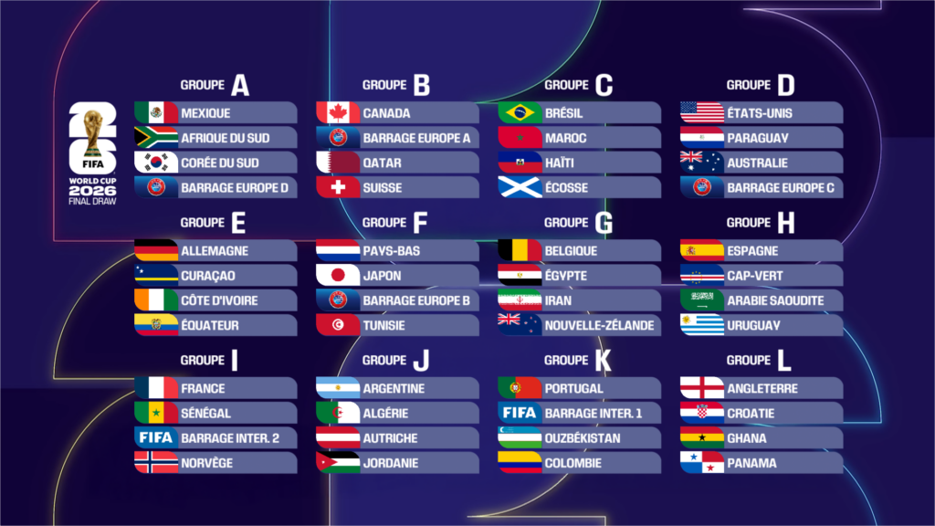 Le tirage au sort a désigné au total 12 groupes de quatre nations. Certaines affiches promettent déjà une intensité rare : Brésil – Maroc, Angleterre – Croatie, Portugal – Colombie… Autant de chocs qui promettent un Mondial spectaculaire, porté par la ferveur des supporters