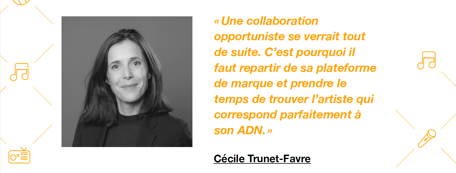 Des intermédiaires sont d’ailleurs dédiés au travail de recherche et de mise en relation entre artistes et marques affinitaires, comme le précise la directrice commerciale de M6 Unlimited, Charlotte Gay : « avec M6 Unlimited et M6 Interactions, nous mettons en relation nos artistes avec des marques en cohérence avec leurs valeurs. C’est ainsi que l’on crée des collaborations pertinentes. »