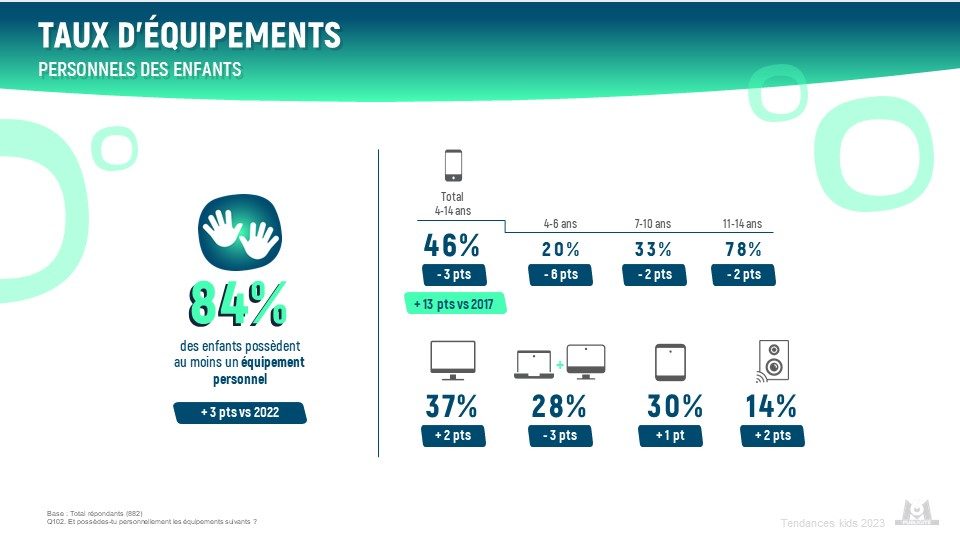 Concernant l’équipement personnel des enfants de 4-14 ans en France, bien que le smartphone reste en tête (46 %) on constate pour la première fois dans l’étude une baisse de l’équipement personnel en smartphone et en ordinateur (respectivement -3 pts vs 2022). Ce qui peut s’expliquer par une sensibilisation aux risques de surexpositions aux écrans et un contrôle parental plus conséquent, en particulier auprès des tout-petits. Un signal faible à confirmer en 2024.