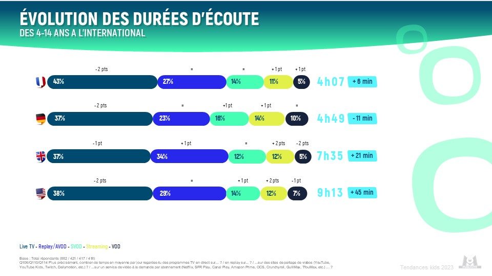 En termes de durées d’écoute, notre étude révèle que le LIVE TV demeure le mode de visionnage dominant chez les enfants, représentant environ 40% du temps total de visionnage, et ce dans tous les pays. Cette constance souligne l’importance du LIVE TV dans l’écosystème médiatique des jeunes spectateurs.
