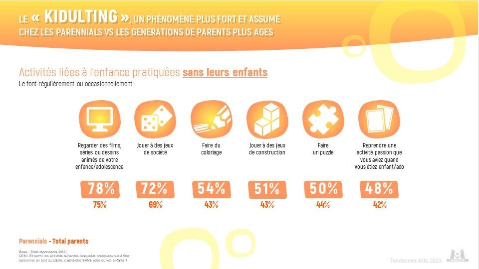 Le phénomène « kidulting » désigne un adulte, avec ou sans enfant, qui continue à avoir des intérêts, à faire des activités ou des loisirs qui sont plutôt destinés aux enfants. Or nous avons ainsi pu mesurer dans l’étude Tendances Kids que ce phénomène est en effet plus significatif chez les parennials que chez les générations de parents plus âgés. Une stratégie employée par les marques jeux et jouets qui amplifient leurs offres destinées aux adultes mais également par de plus en plus de marques d’autres secteurs.
