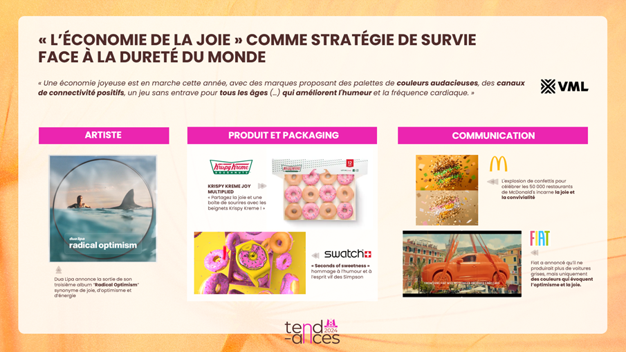 Les marques incitent dès lors les individus à adopter un état d’esprit optimiste, mais rationnel. Une démarche qui consiste à envisager les turbulences du quotidien sous un angle positif mais pragmatique. Une économie de la joie comme stratégie de survie prend forme. Ce contexte de « polycrises » donne en effet un nouveau sens à l’émotion vitale qu’est « la joie ». Les individus ont plus que jamais besoin d’énergies positives, de connexions émotionnelles puissantes et de légèreté. Les marques ont ainsi un rôle clé à jouer pour stimuler cet état émotionnel auprès de leurs communautés que ce soit dans les stratégies de communications ou les innovations produits.