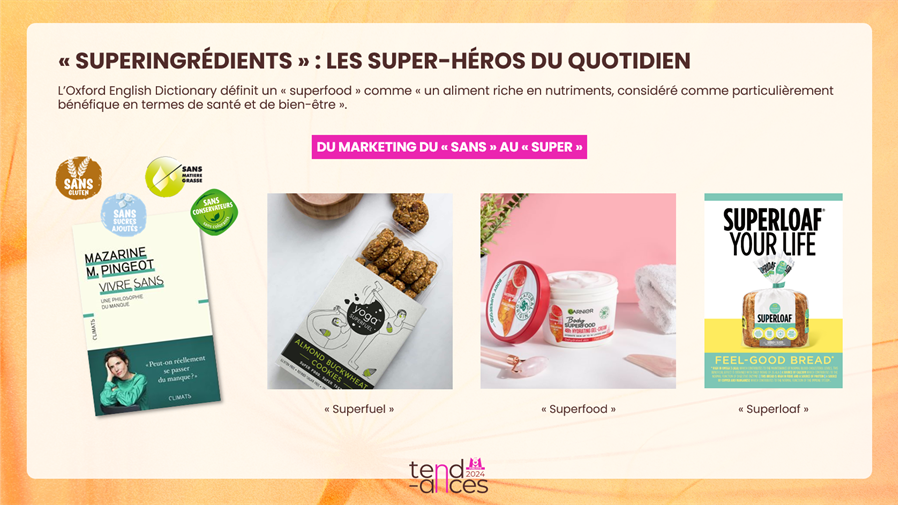Les Français cherchent à réduire et modérer leur consommation d’alcool. Une tendance de fonds qui voit émerger des alternatives aux boissons alcoolisées comme le « No-low », ou encore des « sobreuvages » créés par Benoît d’Onofrio, premier « sobrelier » de France. D’un point de vue marketing, « l’absence ou le sans » devient une valeur ajoutée, tout comme la présence d’aliments qui boostent les défenses immunitaires et le bien-être et qu’on appelle « superfood ». Des marques proposent aussi des produits qui soutiennent les consommateurs en fonction de leur situation hormonale, tandis que d’autres s’érigent en compagnons émotionnels des consommateurs face à toutes les situations de stress de la vie quotidienne.