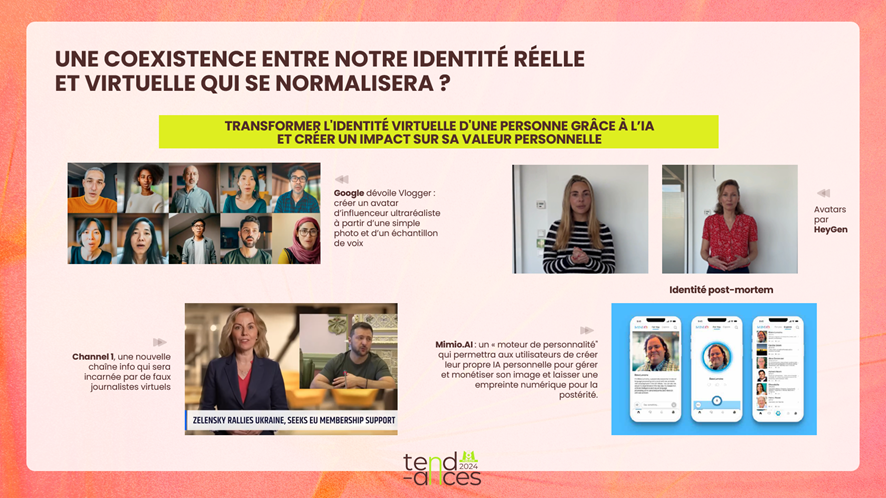 Les progrès liés à l’IA ont profondément requestionné le rapport à notre humanité et notre identité. Une nouvelle économie de l’identité est en marche, qui laisse entrevoir un nouvel horizon où la co-existence de nos identités virtuelles (avatars) et nos identités réelles (humaines) se normaliserait. Un futur où chacun pourrait gérer et monétiser son avatar, pour même le faire perdurer post-mortem.