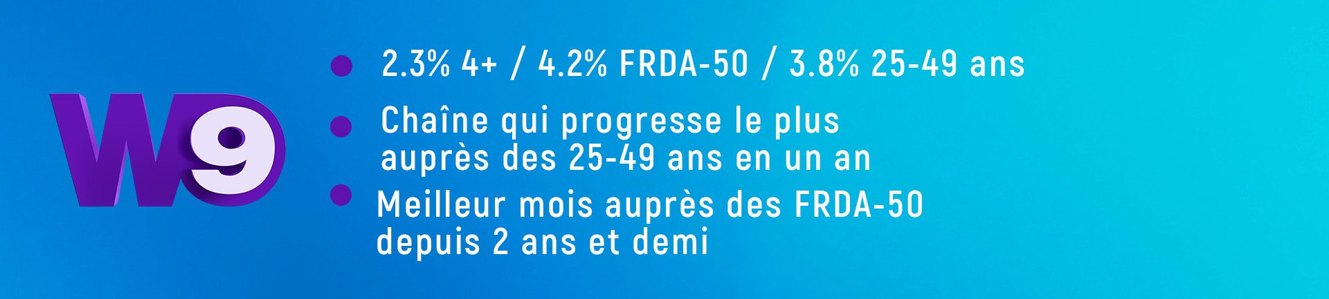 UN DINER PRESQUE PARFAIT : très bonnes performances pour le bloc, W9 4ème chaîne nationale auprès des FRDA-50 / -50 ans sur le mois : 5% FRDA-50 / 4% -50 ans