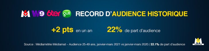 Source : Médiamétrie Médiamat – janvier mars 2021 vs janvier mars 2020 – Audiences M6, W9, 6ter, Gulli – Source audiences : Médiamétrie/ Médiamat – Saison 2020-2021 en cours, chaine M6, cible E25-49 et FRDA 15-49 ans