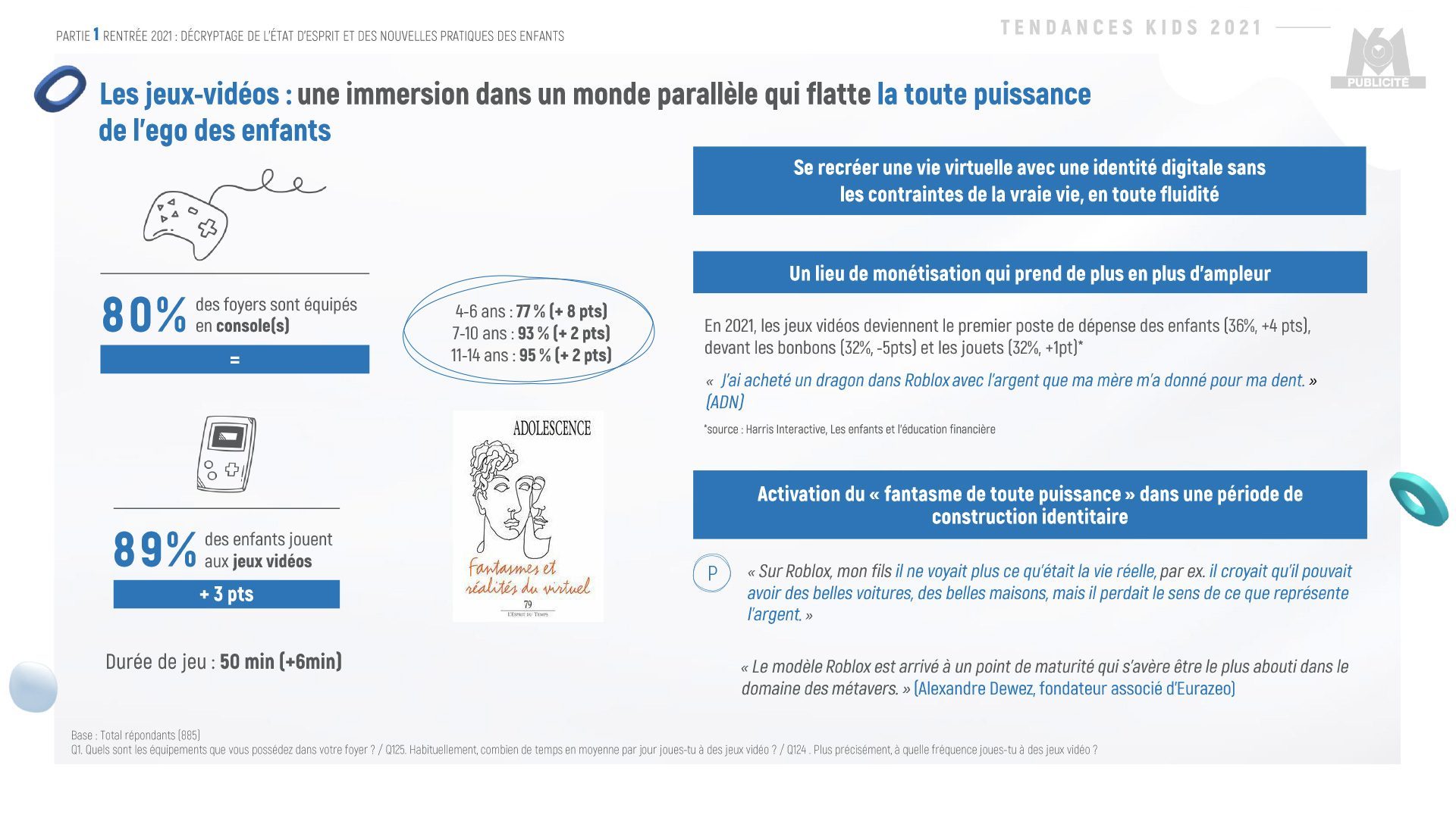 Aujourd’hui, 9 enfants sur 10 jouent aux jeux vidéo en moyenne 50 minutes par jour soit 6 minutes de plus que l’année dernière. Un autre signal fort est la monétisation, au sein des jeux vidéo, qui s’est accélérée en 2021 auprès de cette cible, comme acheter par exemple des objets virtuels pour habiller son avatar sur la plateforme Roblox. Jongler entre mondes réels et virtuels devient presque une normalisation pour la génération alpha : jouets adossés à des NFT, jeux mixant jouets physiques et réalité virtuelle ou encore achats virtuels. Les nouveaux codes et habitudes digitales spécifiques de cette génération sont une opportunité de diversification pour les marques et de générer davantage d’engagement auprès d’elle.
