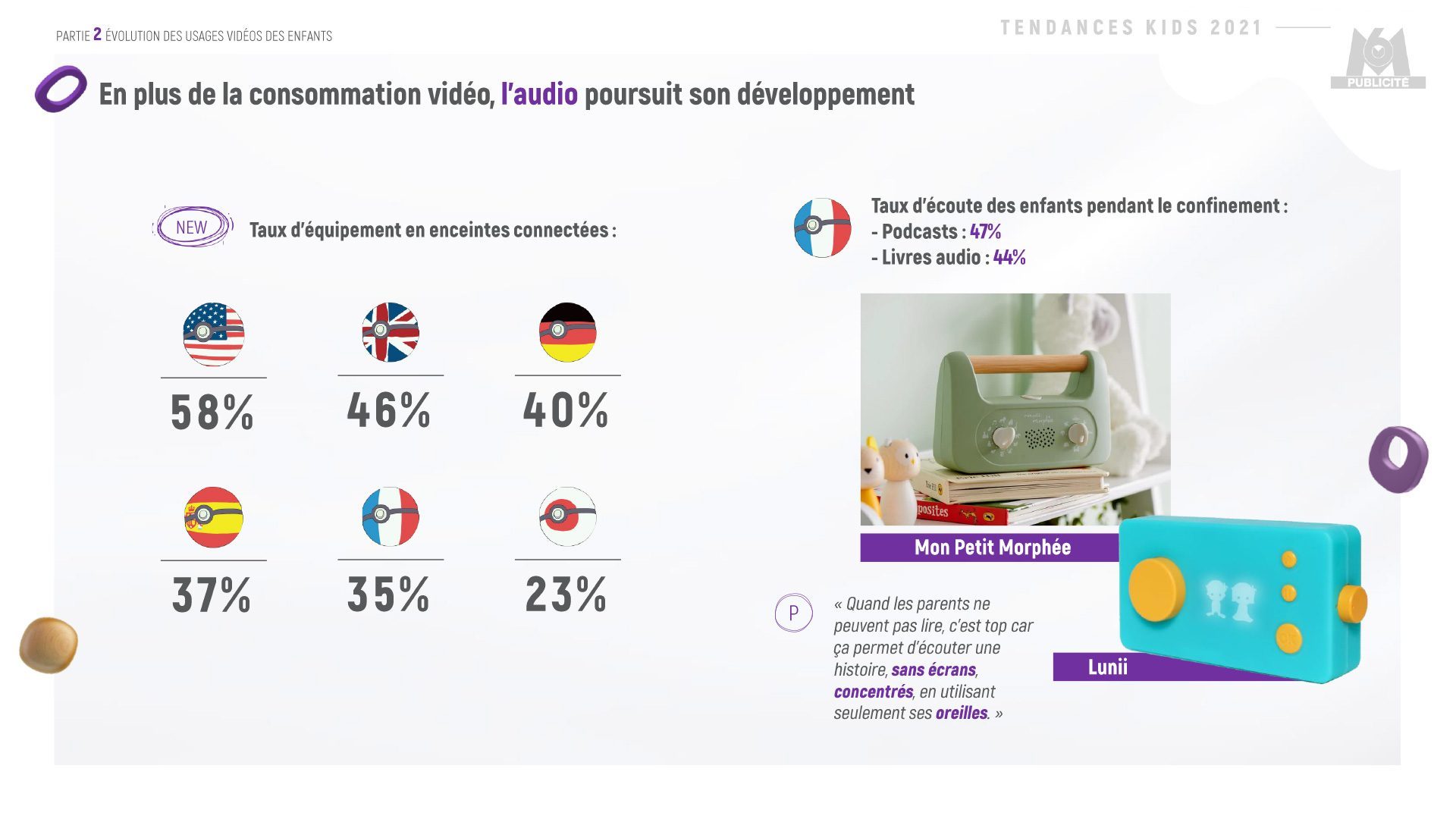 Enfin, le taux d’équipement des familles françaises avec enfants aux enceintes connectées s’élève à 35% : une évolution à suivre alors que le marché de l’audio poursuit son expansion.