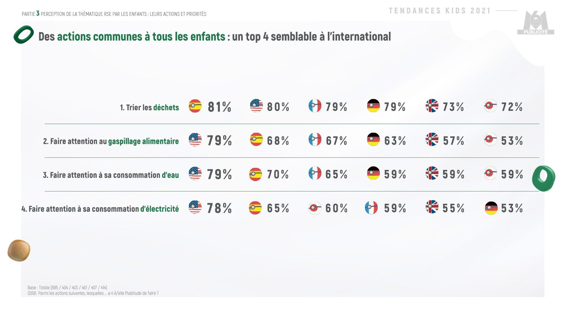 Face à leurs peurs, les spécialistes recommandent de les inciter à agir. Justement, en terme d’actions, nous avons fait le classement des éco-gestes que les petits Français déclarent avoir l’habitude de faire. On retrouve dans le top du classement des éco-gestes usuels du quotidien. Le tri des déchets, le moindre gaspillage alimentaire, faire attention à sa consommation d’eau et d’électricité sont en tête des pratiques. Un top 4 semblable à international.